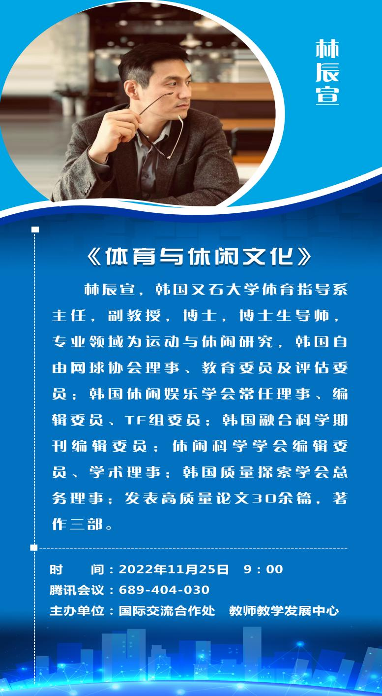 2022年11月25日上午9点,国际交流合作处联合教师教学发展中心邀请韩国又石大学林辰宣教授为新葡萄师生进行线上讲座。讲座主题为《体育与休闲文化》。本次讲座由教师教学发展中心副主任张彦秋教授主持,新葡萄教师,博士、硕士研究生近200人参加了本次讲座。