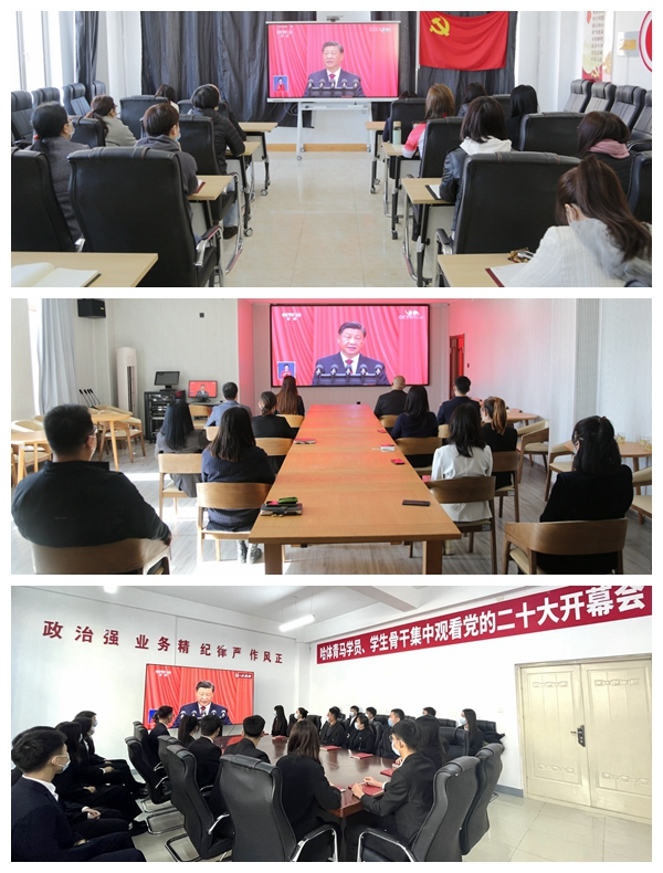 校领导、党政机关、教学教辅部门主要负责人、各党总支、直属党支部书记、黑龙江省滑雪运动学校校长在尚德楼三楼学术报告厅主会场集中收听收看了党的二十大开幕会。各党总支、直属党支部均在本总支、支部组织党员干部、学生党员集中收听收看,校团委组织团员青年代表在大学生活动中心、学生食堂、六公寓会议室集中收听收看,求智楼屏幕同步直播大会实况,供其他在校党员干部师生员工收听收看,实现收听收看全覆盖。