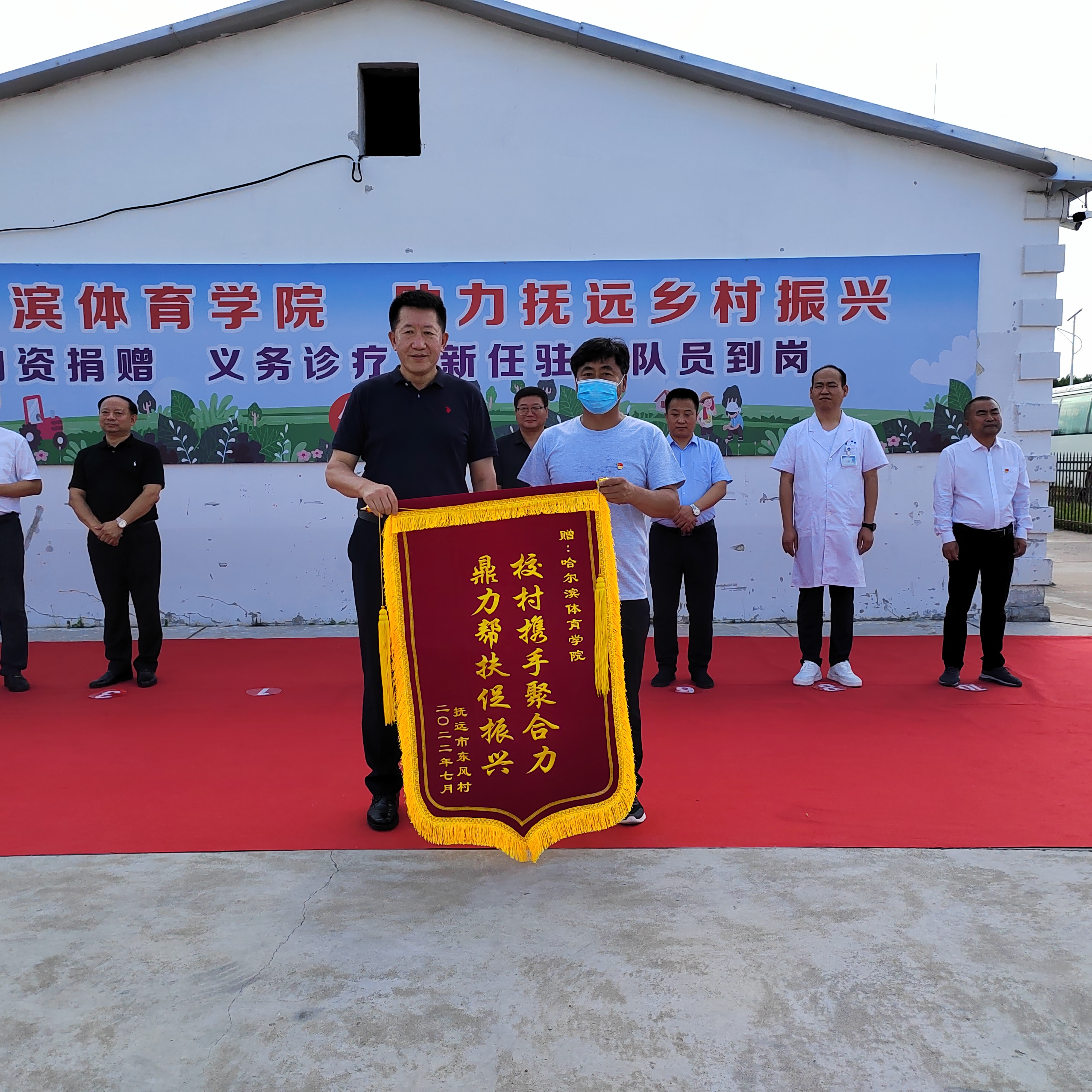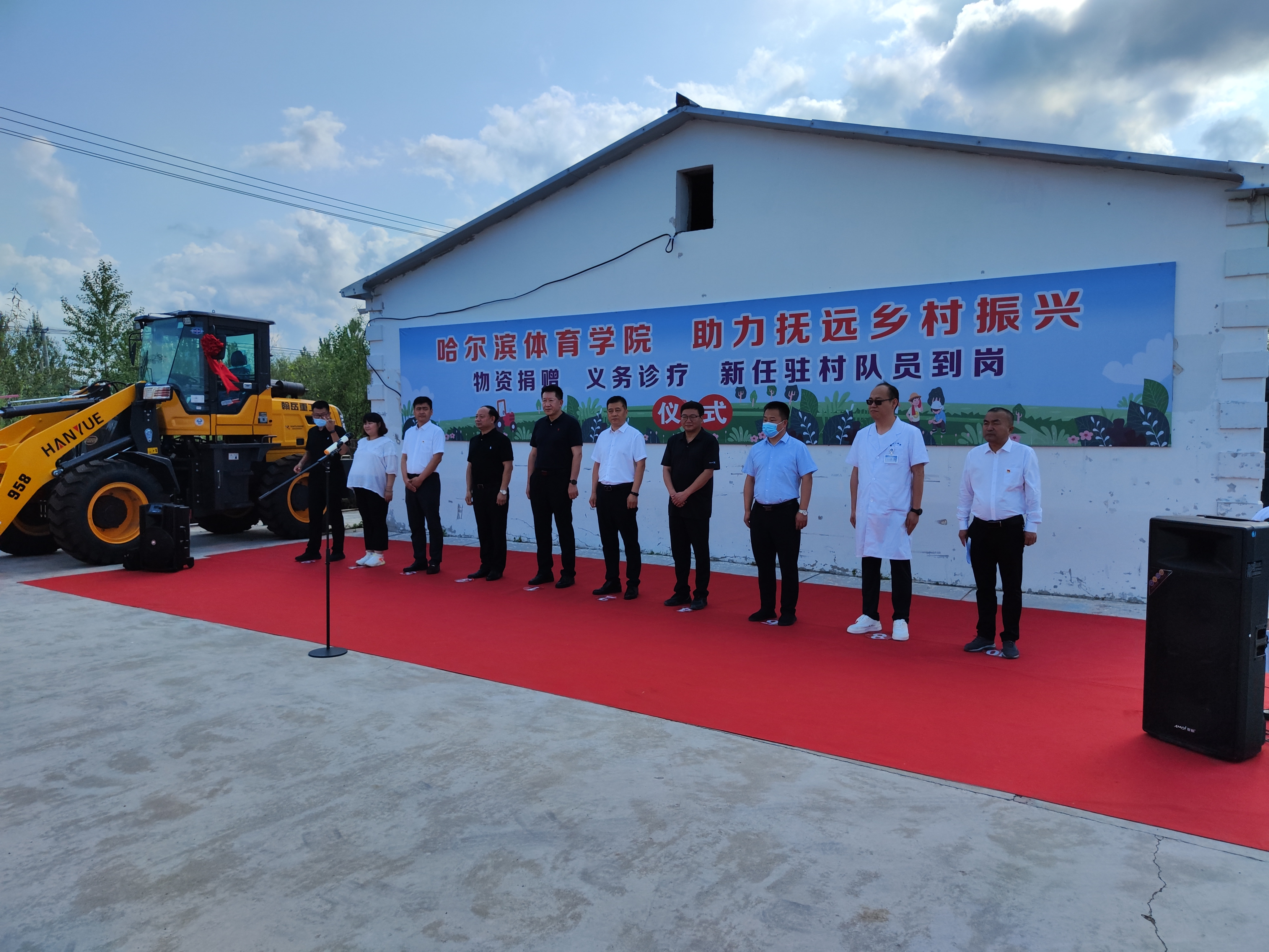 7月26日下午,新葡萄8883官网AMG助力抚远乡村振兴物资捐赠、义务诊疗、新任驻村队员到岗仪式在东风村委会举行。抚远市委常委、组织部长白长海、市委常委、统战部长、通江镇党委书记赫荣丹和抚远市农场事务中心副主任刘进文出席,仪式由驻村第一书记、工作队长白鹏主持。仪式上,校党委书记兰景力代表新葡萄8883官网AMG向东风村赠送装载机连心钥匙,村党支部代表村民为新葡萄8883官网AMG送上书有“校村携手聚合力,鼎力帮扶促振兴”的锦旗。工会主席赵俊岭在致辞中指出:一直以来,新葡萄党委积极响应党中央和省委号召,认真贯彻落实精准扶贫、精准脱贫和乡村振兴战略。自2015年至今已派出4批次、12名干部教师开展驻村工作,工作队全面履行职责,在建强村党组织、推进强村富民、提升治理水平及为民服务等方面精心谋划、积极作为,不断取得新进展。今后哈体院还将持续关注抚远各项事业发展,利用高校资源优势加强校市合作,不断为抚远经济建设添砖加瓦。抚远市委常委、组织部长白长海在致辞中向校领导一行表示衷心感谢,并表示多年来哈体院驻村工作队充分发挥高校特点和优势,为推进东风村乡村振兴做出了重要贡献,并希望今后和村两委紧密配合,带领村民进一步完善基础设施建设,提升基层治理效能,加快农业生产步伐,汇聚更强大力量,带领村民早日过上小康生活。