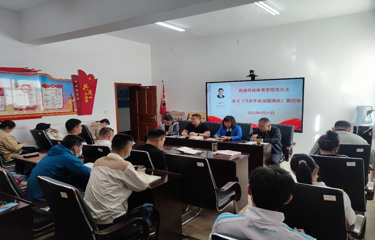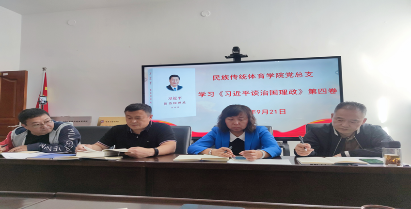 按照学校党委的统一部署,民族传统体育学院党总支精心组织安排,将《习近平谈治国理政》第四卷作为本学期政治理论学习的重点内容之一。9月21日下午,学院党总支书记呂吉勇在学院会议室为全体教师进行专题宣讲,学习活动采取线上线下相结合的方式进行。