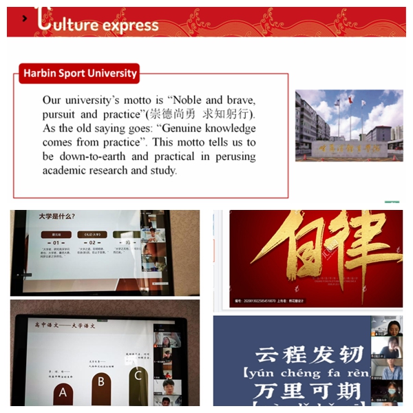 在《大学语文》的第一课中,引用了教育家蔡元培在1918年《北京大学月刊发刊词》提到的观点:“大学者,研究高深学问者也;大学者,囊括大典,网罗众家之学府也”来启迪学生勤思勤学;在《大学英语》教学中,结合课程内容,融入了“不负韶华”的理想信念及哈体人都应牢记的校训“崇德尚勇,求知躬行”,作为培养新时代有作为的体育人的思政元素;在对新闻学专业新生讲授《中外新闻史》中,从育人的角度出发,引导学生坚守马克思主义新闻观,形成对中国特色社会主义新闻学理论体系的认知与认同,以及作为媒体人帮助大众树立文化自信的使命感;在《综合英语》课堂上,组织新生探讨了对本专业和课程科目的认识,帮助学生意识到所学专业在社会发展中的重要性,从而实现增强专业学习的责任感和使命感,激发学生学习动力的良好的教学目标。
