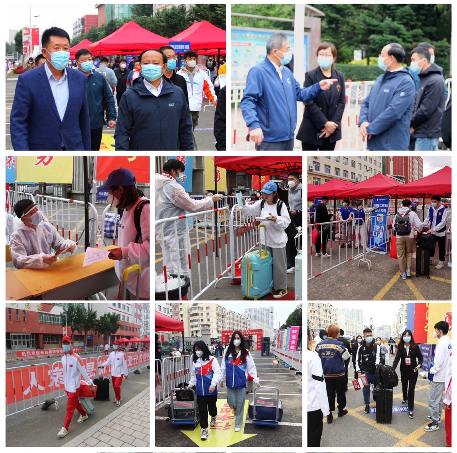 早晨六点半,青年志愿者们就已经就位,等待着来自四面八方的莘莘学子。志愿者们分工明确,他们为入校新生进行行李消杀、更换口罩,负责提醒出示健康码、扫描入校码、测量体温、搬运行李,全天不间断的为学弟学妹们提供最热情、最无私的帮助,尽心尽力坚守在各自岗位,有条不紊地确保每个环节顺利进行。