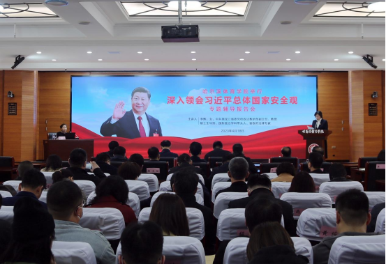 为贯彻落实党的二十大报告关于“建设具有强大凝聚力和引领力的社会主义意识形态”要求,扎实开展学习贯彻习近平新时代中国特色社会主义思想主题教育,更广泛地把全校党员干部师生员工团结在以习近平同志为核心的党中央周围,新葡萄8883官网AMG于2023年4月18日下午在尚德楼三楼学术报告厅举办《深入领会习近平总体国家安全观》专题辅导报告会。报告会邀请到中共黑龙江省委党校政法教研部副主任,硕士生导师,国际政治学科带头人,省政府法律专家李辉教授担任主讲人。校党委领导班子全体成员、全校副处级以上干部、全体辅导员及网评员在主会场聆听了讲座,讲座通过腾讯会议同步向全校师生进行直播。本次报告会由党委宣传统战部部长于晓阳主持。