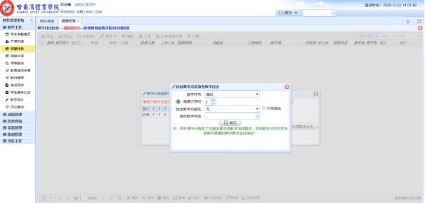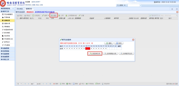 选择设置完教学进度的课程,点击“教学日历”按钮,如下图所示: