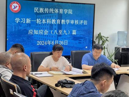 为深入贯彻新一轮本科教育教学审核评估的精神,民族传统体育学院于6月26日组织全体教师开展了(八至九)篇应知应会学习工作会议。此次活动由李世宏副院长主持,旨在加强教师对教育教学评估的理解与掌握。