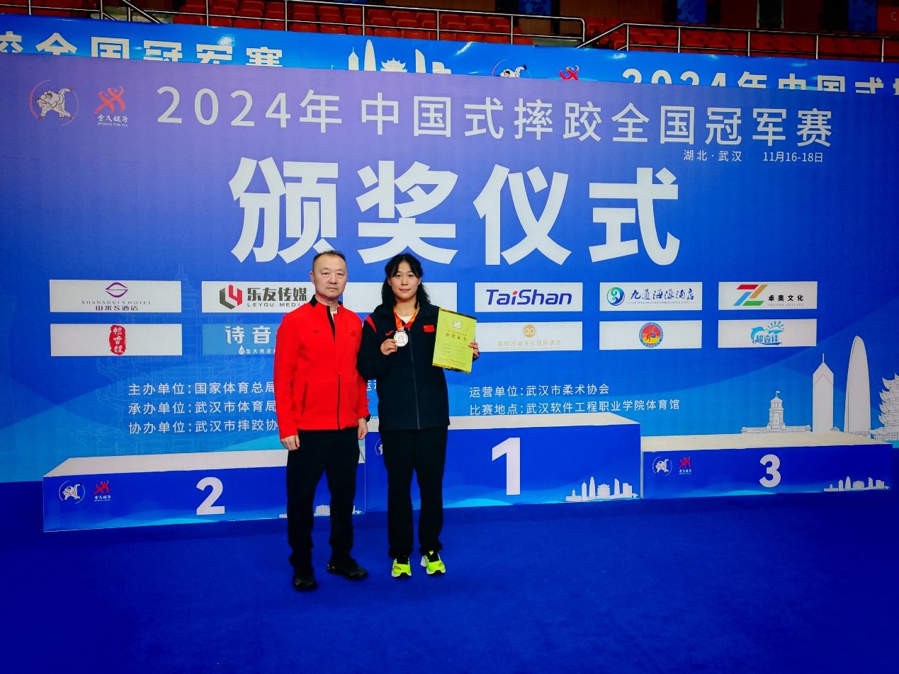 新葡萄由民族传统体育学院教练员宫照麟带领2021级高宇飞参赛,经过四轮激烈角逐,高宇飞勇夺女子70公斤级亚军。